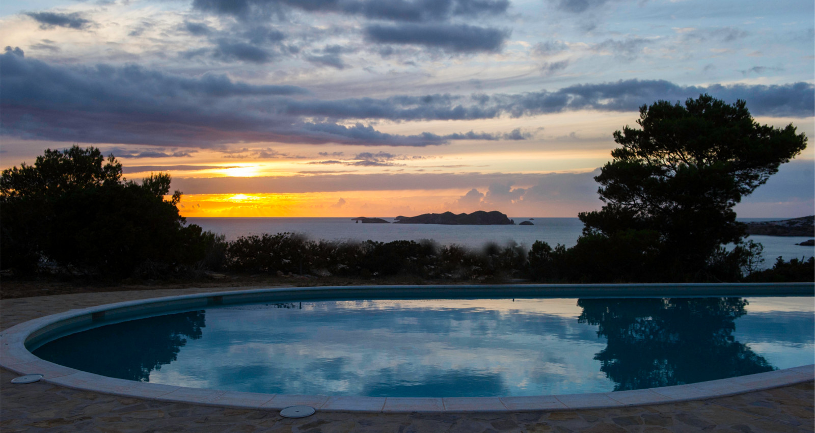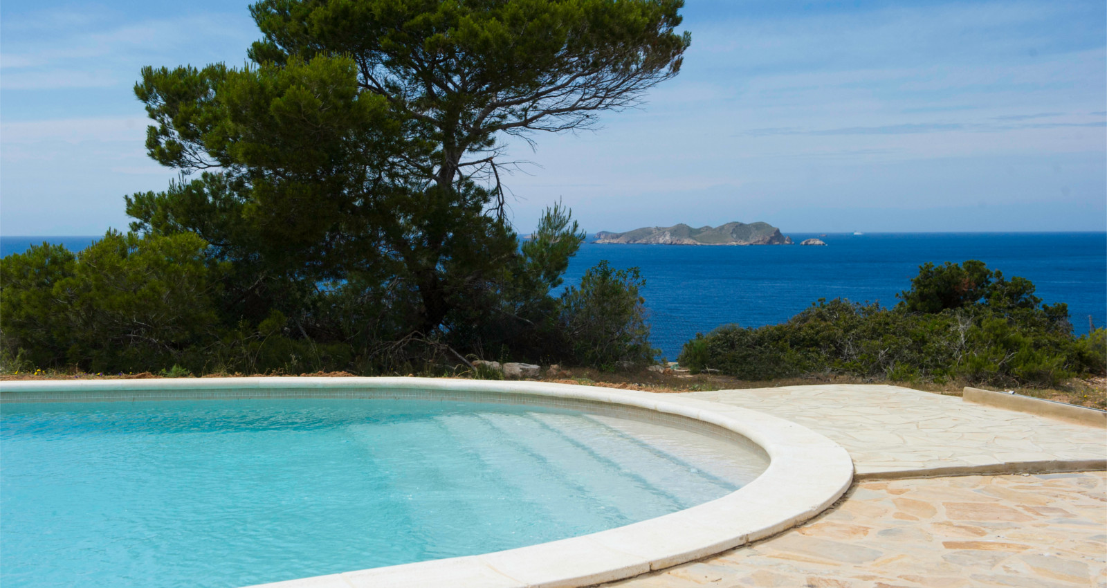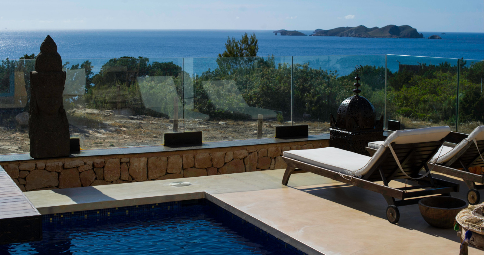 House with a large private swimming pool by the sea. It is next to Cala Tarida with spectacular views of the sunset in the most beautiful area of Ibiza. 600 m away from the beach, Can Vidal has all the comfort. One of the main attractions of the house is the swimming pool with sea and sunset views, the sun sets spectacularly over the Mediterranean Sea and the islands of S’Espartá. The two chill out terraces are perfect to enjoy your holidays in a unique and relaxed atmosphere by the sea.