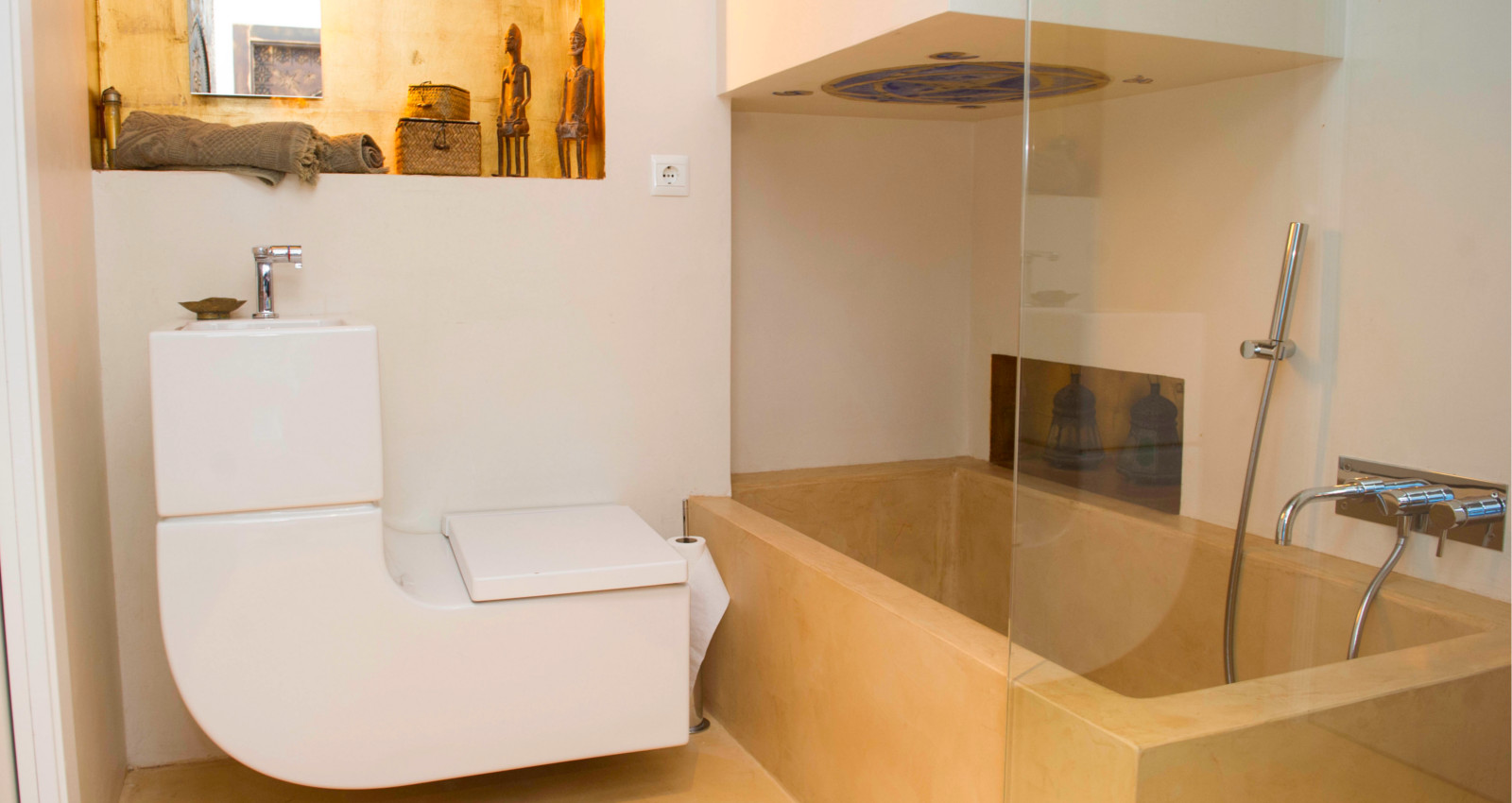 The house has three bedrooms, two Moroccan inspired Suites a 2 X 1,40m bed and their own bathroom. The third room has a trundle bed with two 1,90m X 0,80m beds. All in all, there are 3 bathrooms, nicely decorated, two of them with a shower. The master suite has a bed and a large bathtub, overlooking the see.