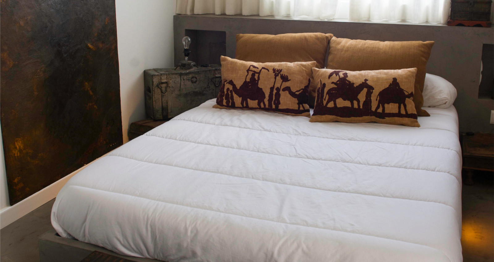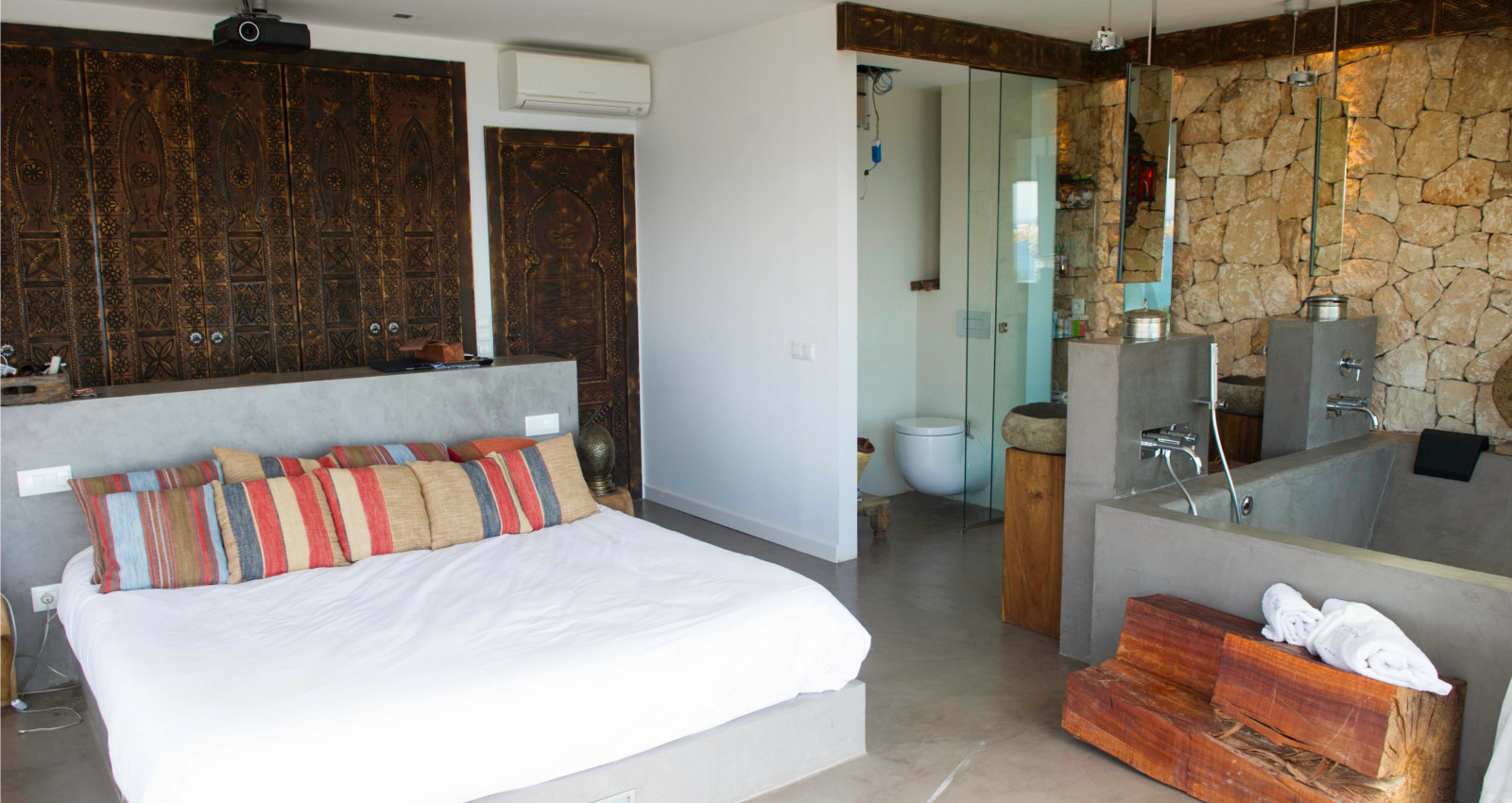Las dos terrazas chill out son perfectas para disfrutar de las vacaciones en un ambiente único y relajado al lado del mar. La casa cuenta con tres dormitorios . 2 Suites de inspiración marroquí con cama de 1,40m por 2 y baño propio. La tercera habitación tiene una cama nido con dos camas de 0'80 por 1,90. En total tiene tres baños con una cuidada decoración, dos de ellos con ducha. La suite principal tiene la cama y la gran bañera con vistas al mar. Toda la casa esta hecha con microcemento y los muebles son de Bali y Marruecos.